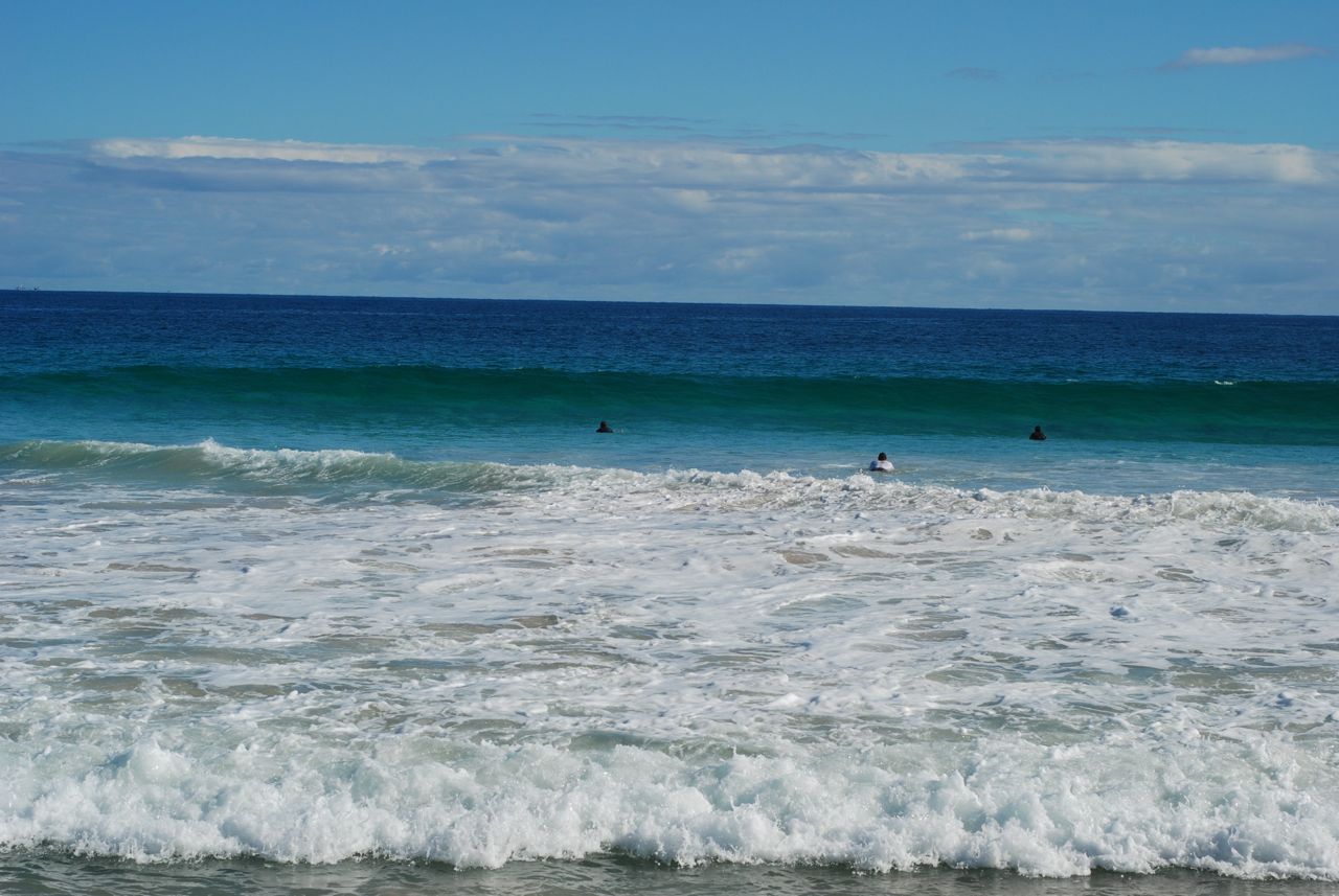 L’oceano era pieno di gente di ogni eta’ che “surfava l’onda”, magnifico, un’onda cosi’ regolare, bella, ordinata. Di colore blu intenso al largo e cristallino a riva.