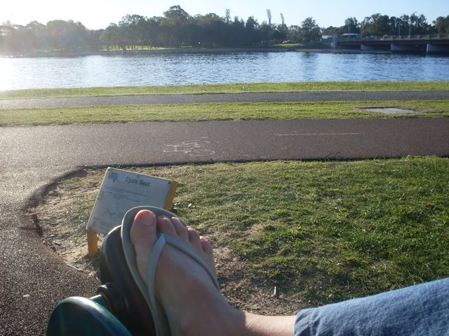 Sono in infradito e faccio un po’ di bicicletta guardando i grattacieli di Perth da sud… …