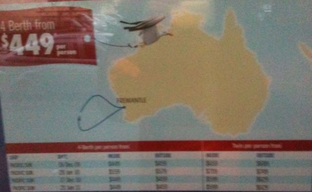Per dove si parte? bhe, non sottolineiamo troppo dove farete la prova… diciamo che andate qualche miglia fuori Freo e tornate indietro dopo 3 giorni! Cose da vedere?! Bhe, la nave e le sue attrazioni e l’oceano!!