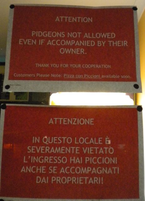 1. peccato…volevo portarne qualcuno dalla piazza duomo di Milano, ma se non posso entrare in quel locale….si vede che la vecchietta deve averne combinata qualcuna delle sue con i suoi piccioni. originale l’avviso, non l’avrei mai pensato!