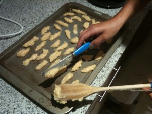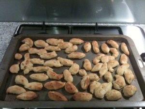 Se avete una sacca in tela bene, altrimenti aiutatevi con un coltello e formate dall’impasto tanti piccoli “grissini” lunghi circa 5cm su una placca rivestita di carta forno. (io non l’avevo…) (distanziateli un po’ perche’ si gonfieranno)