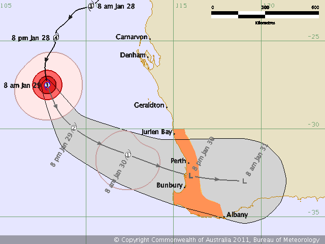 Attualmente di “classe 3” su una scala di 5, sta perdendo velocita’ ed e’ previsto arrivare domani sulla costa. Perth e’ sul suo percorso, ma non preoccupatevi, abbiamo gia’ fatto scorte di cibo, acqua e batterie!