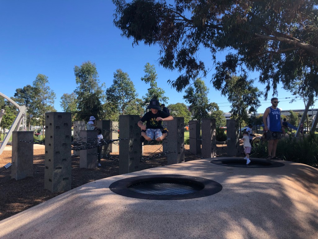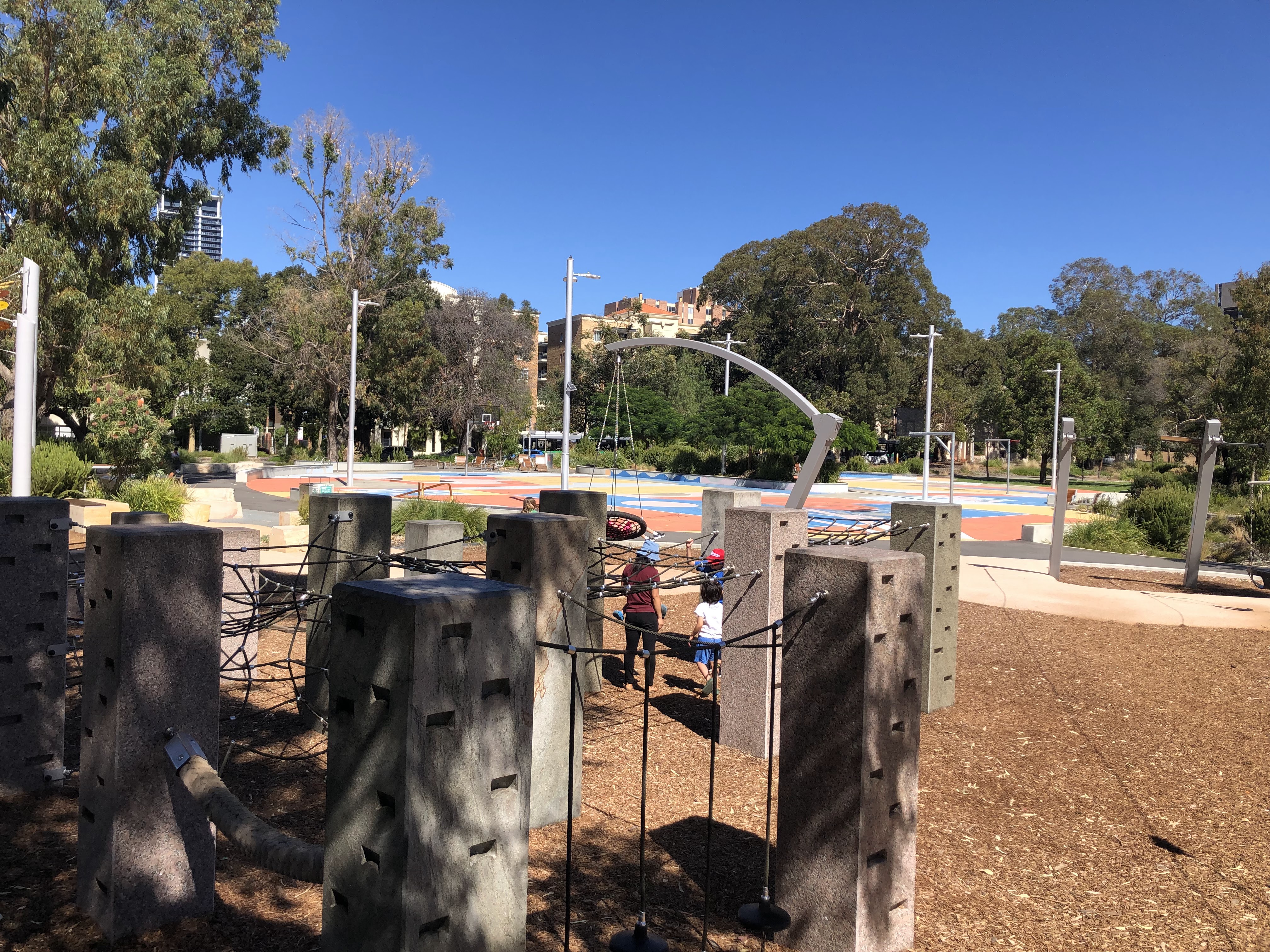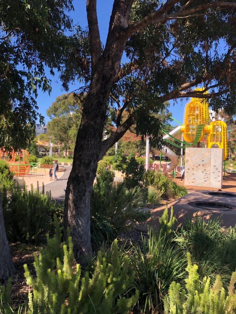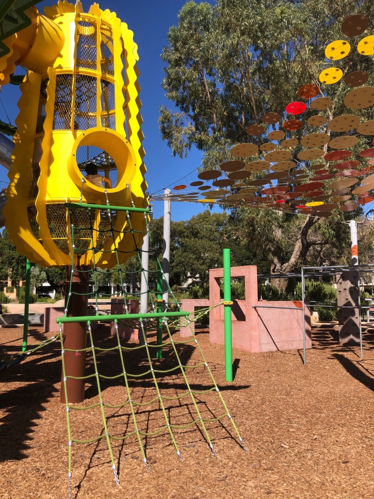 Wellington Square playground, a East Perth. Se non siete mai stati vale la visita. Si trova in pieno centro città, collegato dal CAT o a una decina di minuti a piedi dalla stazione del treno offre attrazioni per tutte le età. Parzialmente all’ombra , ha scivoli, trampolini, zip lines e un sacco di attrezzatura per arrampicarsi. Ecco qualche foto!