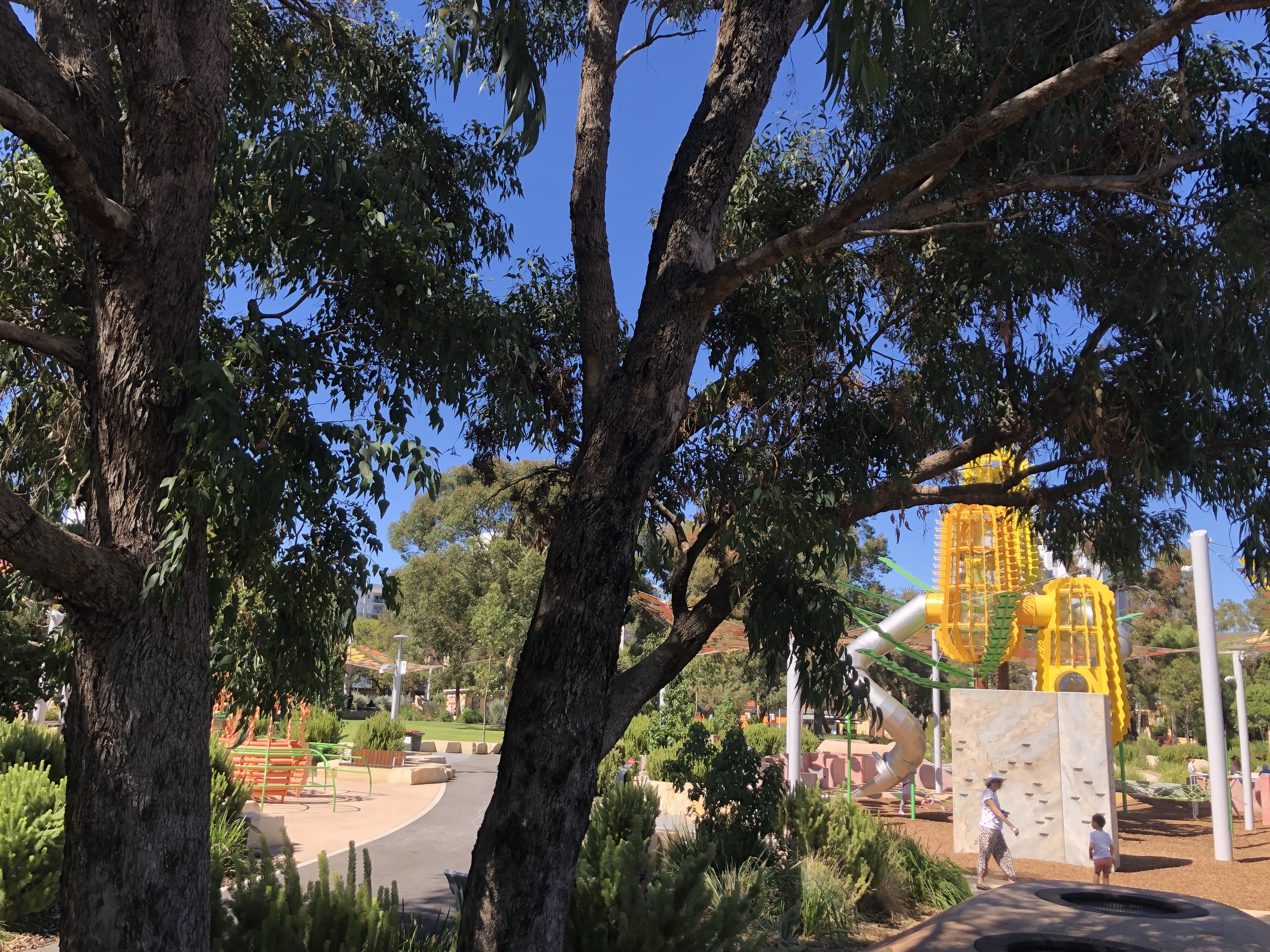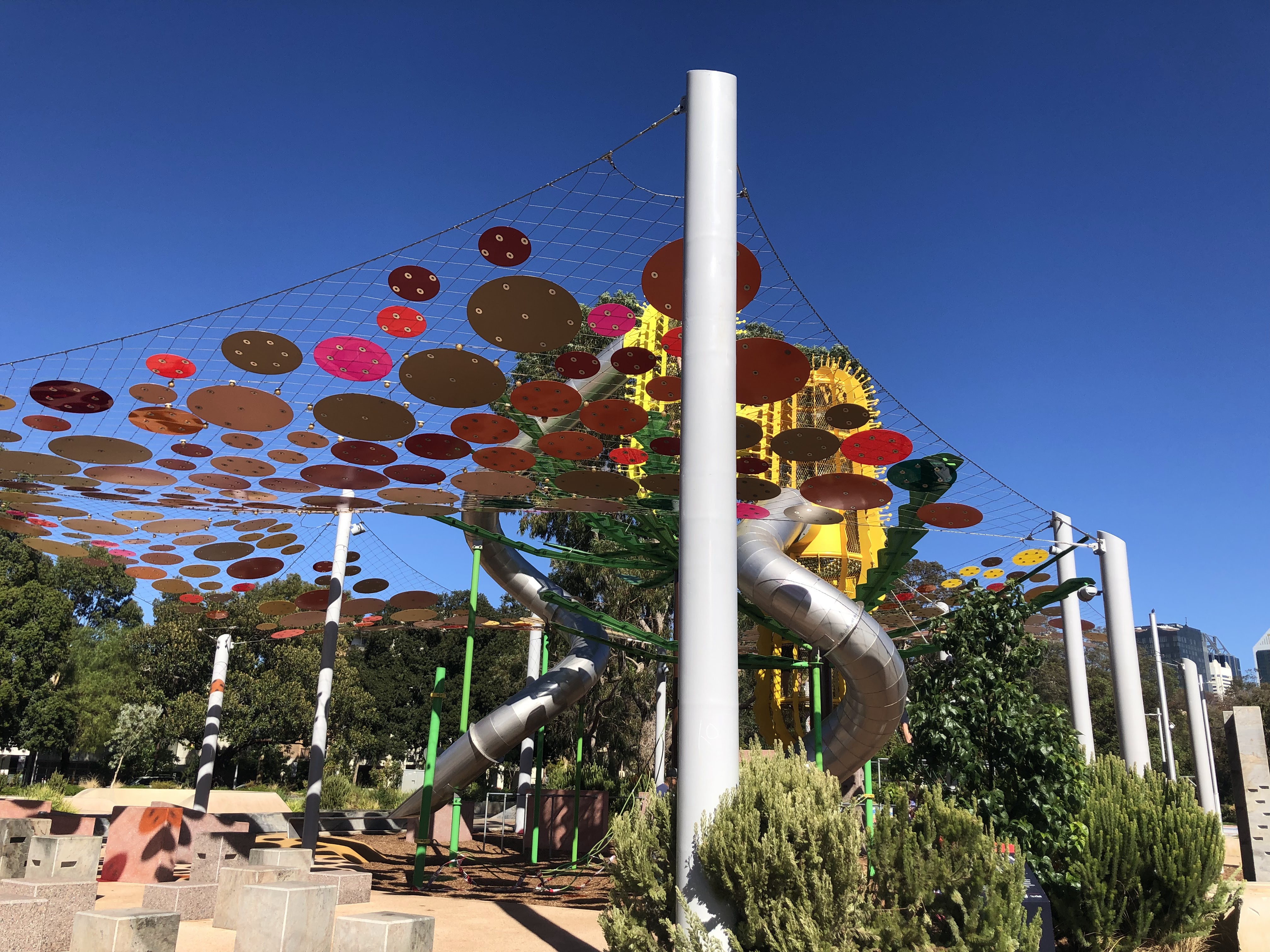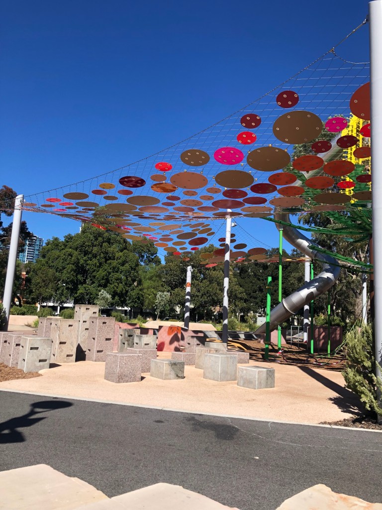 Wellington Square playground, a East Perth. Se non siete mai stati vale la visita. Si trova in pieno centro città, collegato dal CAT o a una decina di minuti a piedi dalla stazione del treno offre attrazioni per tutte le età. Parzialmente all’ombra , ha scivoli, trampolini, zip lines e un sacco di attrezzatura per arrampicarsi. Ecco qualche foto!