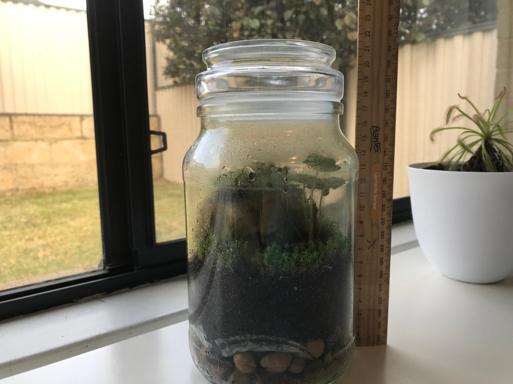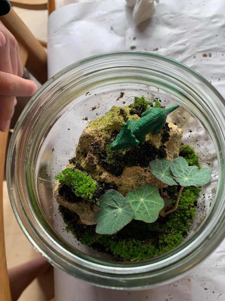 Ecosistema in un vaso -terrario: dotato di termometro per mantenere la temperatura sotto controllo , misuratore di pH e umidità , l’ecosistema è costituito da uno strato di sassolini alla base, un filtro biologico per far penetrare l’acqua e non farla ristagnare, terriccio e terreno di varia natura, muschio, piante e oggetti ornamentali.